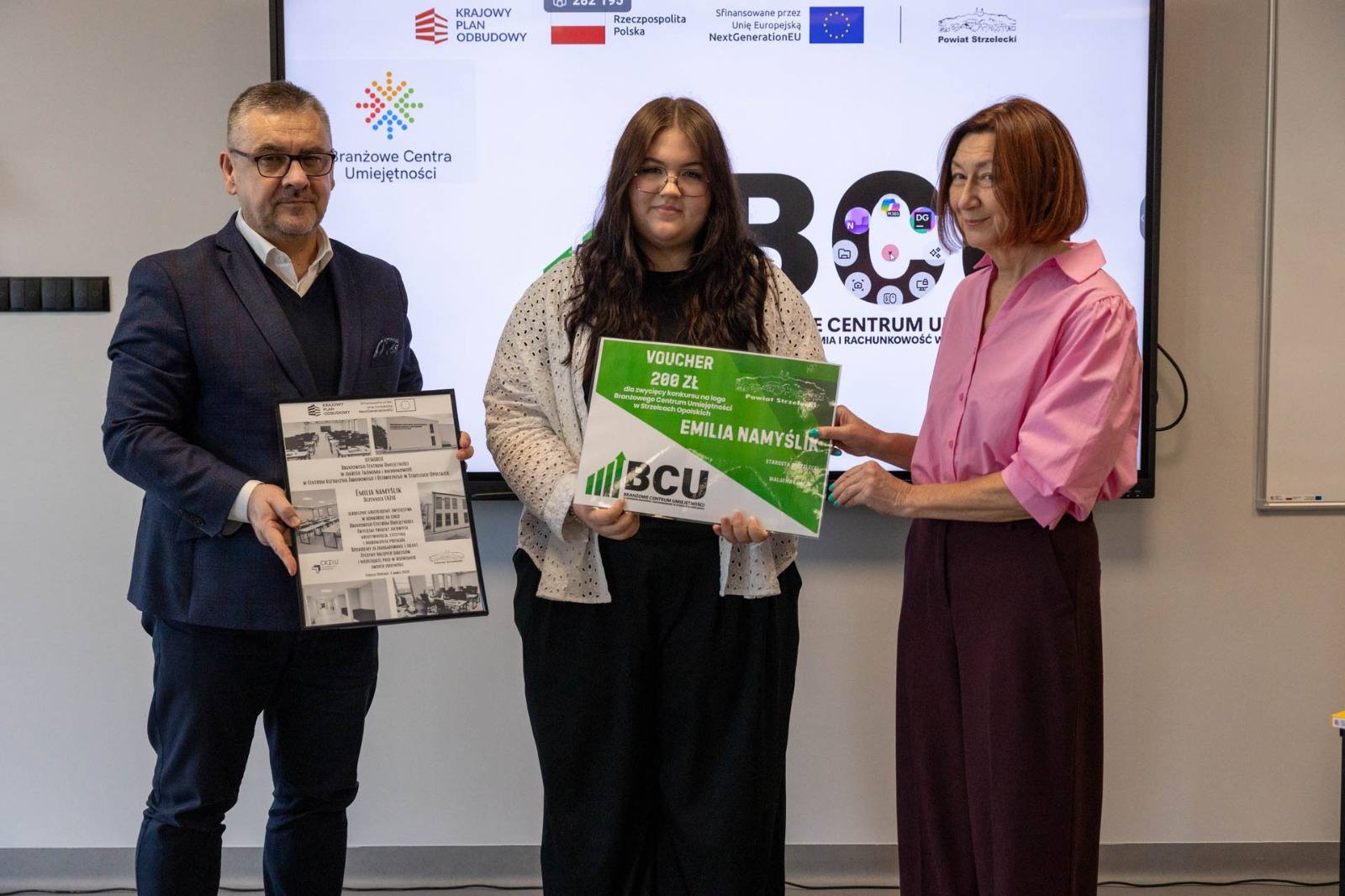 Podczas uroczystego otwarcia BCU Emilia otrzymała podziękowanie z rąk przedstawicieli: CKZiU i Branżowego Centrum Umiejętności – Pani Dyrektor Haliny Kajstura oraz Powiatu Strzeleckiego – Pana Starosty Waldemara Gaida .